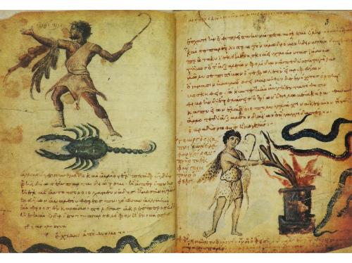 1997. LIBRO. (FACSÍMIL). TERIAKA ALEXIPHARMAKA. Barcelona: Ed. Moleiro, 1997. 8º menor. Fasímil de la farmacología griega cuyo original se custodia en la Biblioteca Nacional de Francia. Enc. en piel, hilos dorados en ambos planos, presentado en un estuche de piel, con el acta notarial que certifica 987 copias. Junto al libro de estudio.