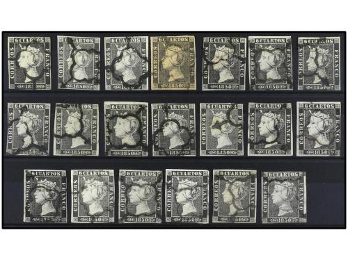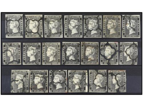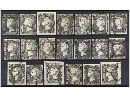° ESPAÑA. Ed. 1 (20). 6 cuartos negro pl. I. Conjunto de 20 sellos con mat. araña negra. Todos con cuatro márgenes.