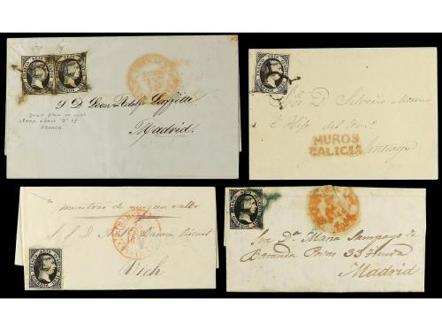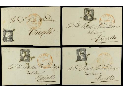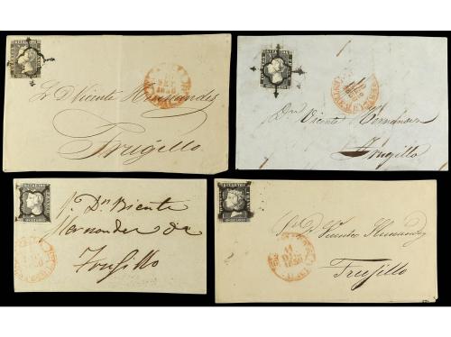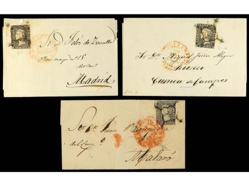 ✉ ESPAÑA. Ed. 1A (3). 1850. 6 cuartos negro. Tres cartas, sellos con márgenes completos.
