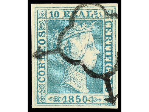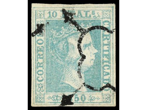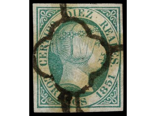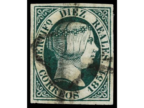° ESPAÑA. Ed. 5. 10 reales verde. Excelente ejemplar, márgenes bien balanceados y matasellos araña muy limpio. PIEZA DE LUJO. Cert. COMEX. Cat. 3.100€.