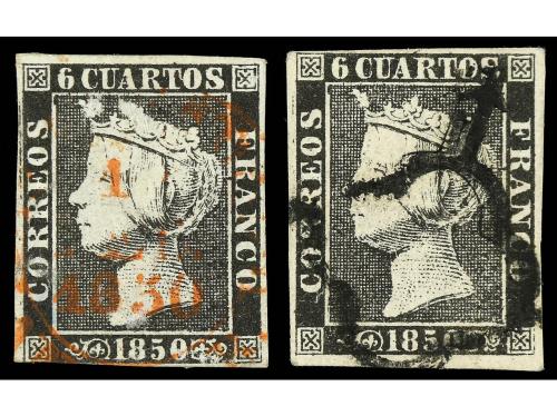 ° ESPAÑA. Ed. 1. 6 cuartos negro. RETOQUE EN EL PELO, tipo 9. Dos sellos, uno con desgaste en el pelo antes del retoque y el otro con el retoque. RAROS. (Guezala pag. 173). Cert. GRAUS.
