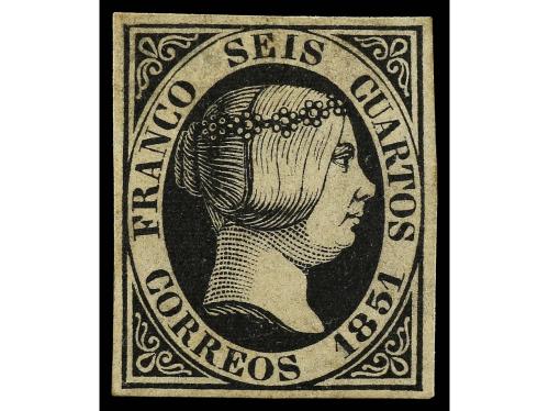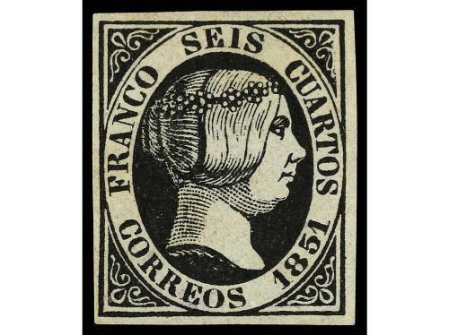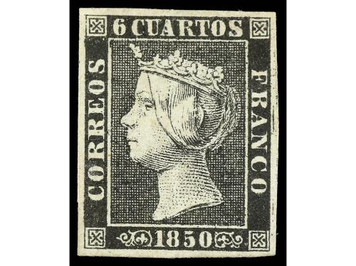 (*) ESPAÑA. Ed. 1A. 6 cuartos negro. Excelentes márgenes. PIEZA DE LUJO. Cert. COMEX. Cat. 580€.
