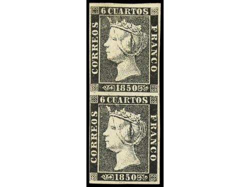 * ESPAÑA. Ed. 1. 6 cuartos negro plancha I. Tipos 2 y 8. Pareja vertical. Sello inferior margen ajustado pero completo. RARO.