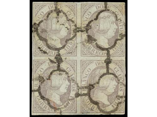 ° ESPAÑA. Ed. 7. 12 cuartos lila. Bloque de cuatro, leve corte en un sello y doblez. Cert. COMEX.