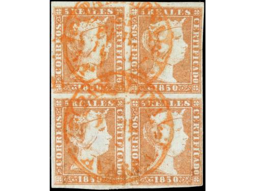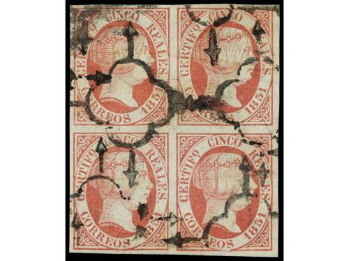 ° ESPAÑA. Ed. 9. 5 reales rojo. Bloque de cuatro. Muy bonito.