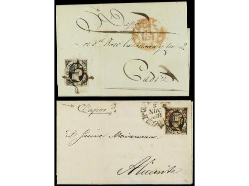 ✉ ESPAÑA. Ed. 6 (2). 1851. 6 cuartos, dos cartas con marcas manuscritas "Vapor" desde Barcelona y Sevilla (correo fluvial).