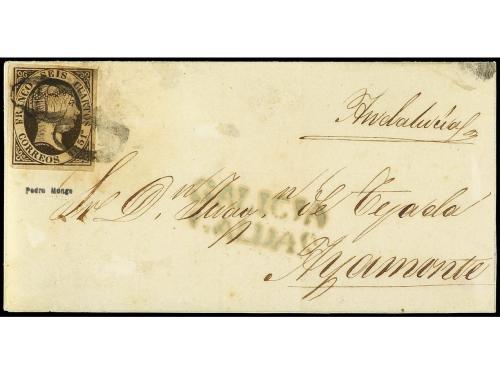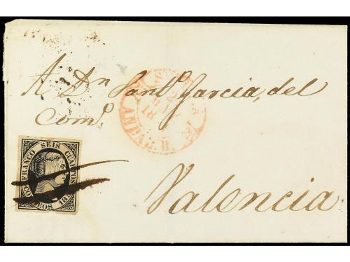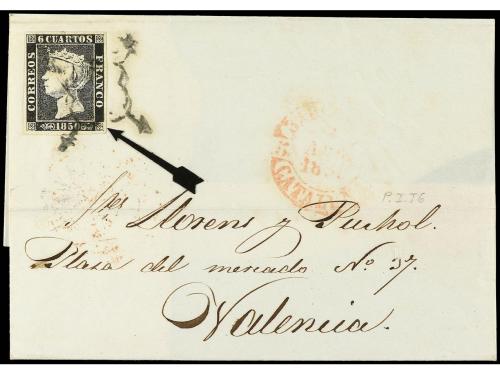 ✉ ESPAÑA. Ed. 1. 1850. BARCELONA a VALENCIA. 6 cuartos negro. Pl. 1. tipo 6. Variedad de impresión falta parte de la línea del marco. No reseñado en Guezala.