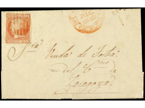 ✉ ESPAÑA. Ed. 12. 1852. TARRASA a ZARAGOZA. 6 cuartos rosa, mat. PARRILLA ROJA. MUY RARA. Cert. COMEX.