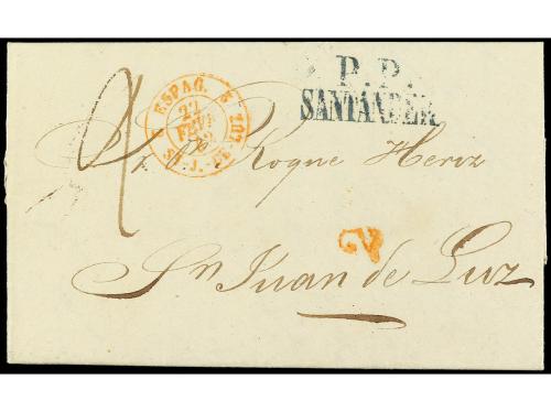✉ ESPAÑA. Ed. 80. 1842. PREFILATELIA. SANTANDER a FRANCIA. Marca P.P. / SANTANDER en azul. PRECIOSA y RARA. (P.E. 20).