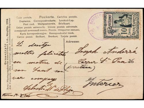 ✉ ESPAÑA. Ed. PEB 4. 1905. BARCELONA correo interior con sello de 10 cts. verde del Servicio Privado de Mensajerías BARCELONA / POSTAL EXPRESS. Muy bonito y RARO.