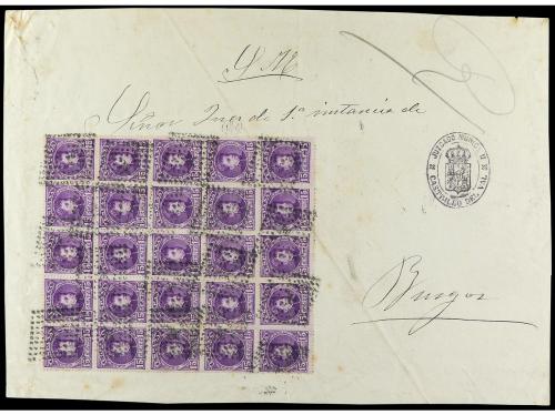 ✉ ESPAÑA. Ed. 246 (25). (1901 CA.). Frente de Póliza Judicial circulada de CASTRILLO DEL VAL (Burgos) a BURGOS con un bloque de 25 sellos del 15 cts. violeta, mat. rombo de puntos de uso muy tardío. Espectacular y raro franqueo.