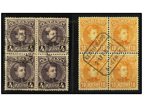 ° ESPAÑA. Ed. 254/55. 4 pts. violeta y 10 pts. naranja. Bloques de cuatro, centrajes perfectos. Muy raros así.