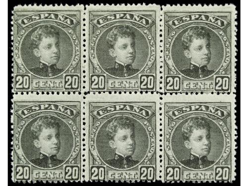 ** ESPAÑA. Ed. 247. 20 cts. negro. Bloque de seis, numeración A000.000. Raros sin fijasellos.