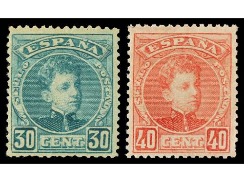 ** ESPAÑA. Ed. 251 y 249. 40 céntimos rosa, muy bien centrado. Diente corto en esquina inferior derecha. Se incluye Ed. ** 249, bien centrado. Ambos, numeración A000,000.