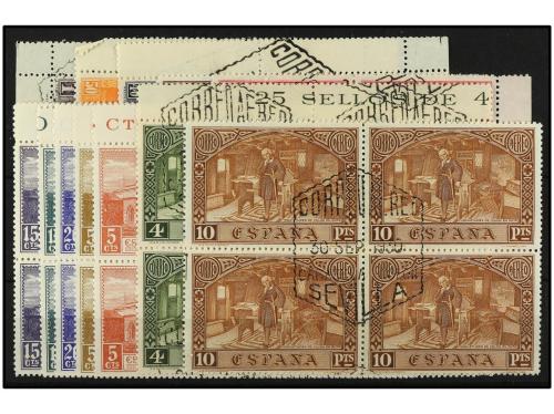 ° ESPAÑA. Ed. 650/4 (4). SERIE COMPLETA, 5 valores en bloques de cuatro. Mat. de complacencia (philatelic cancel). Cat. 360€.