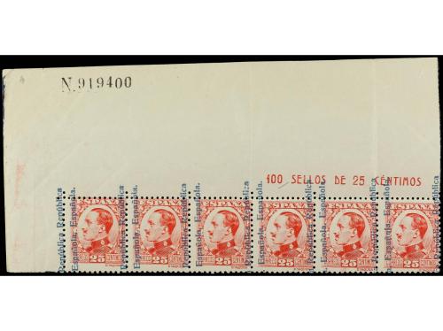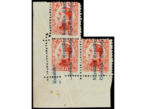 * ESPAÑA. Ed. 598. 25 cts. rojo. Bloque de tres, variedad de impresión por pliegue del papel. ESPECTACULAR y MUY RARA.