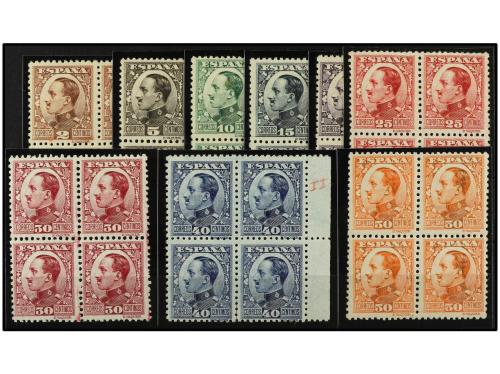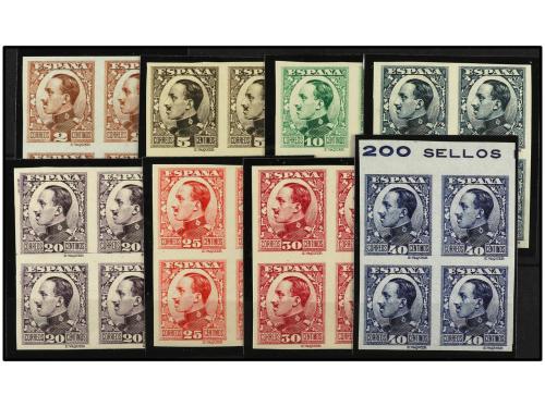 ** ESPAÑA. Ed. 49o/97s. Serie a falta del 50 cts. en bloques de cuatro SIN DENTAR. LUJO. Cat. 1.668€.