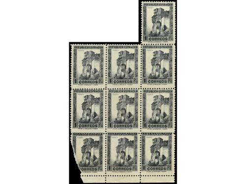 (*) ESPAÑA. Ed. 673F. 1 pta. gris FALSO POSTAL. 1 pta. negro, bloque irregular de nueve, uno defecto. Impresión litográfica. Cert. CEM.