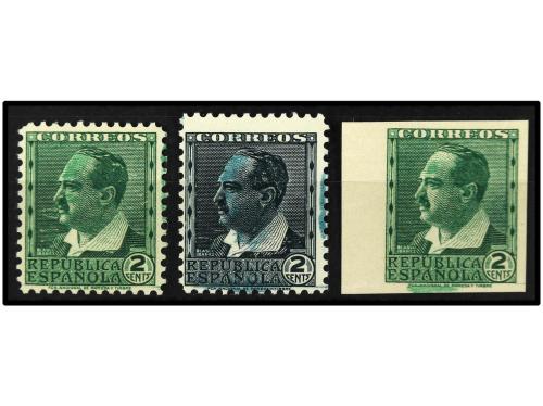 ** ESPAÑA. Ed. 662cc, cca y ccs. 2 cts. verde amarillo, 20 cts. verde oscuro y 20 cts. verde amarillo (está sin goma). COLORES CAMBIADOS. Cat. +180€.
