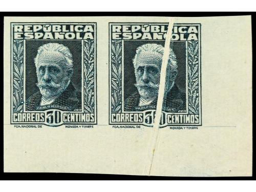 ** ESPAÑA. Ed. 669ccs (2). 30 cts. verde azulado en pareja sin dentar. COLOR CAMBIADO, un sello PLIEGUE DE ACORDEÓN. RARO.