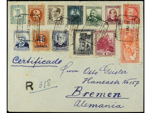 ✉ ESPAÑA. Ed. 674/75, 679, 683/88. 1938. ALICANTE a ALEMANIA. Espectacular franqueo en carta certificada urgente.
