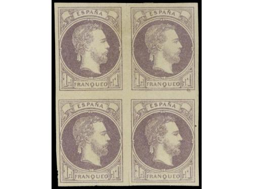 (*) ESPAÑA. Ed. 158. 1 real violeta. Bloque de cuatro. Pequeño corte entre los sellos inferiores. RARO.