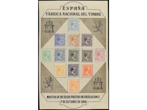 ESPAÑA. Ed. 213/28. HOJA MODELO para la emisión del 1 de octubre de 1889 con los sellos de la serie adheridos a la cartulina. RARA. Cert. COMEX. Cat. 1.750€.