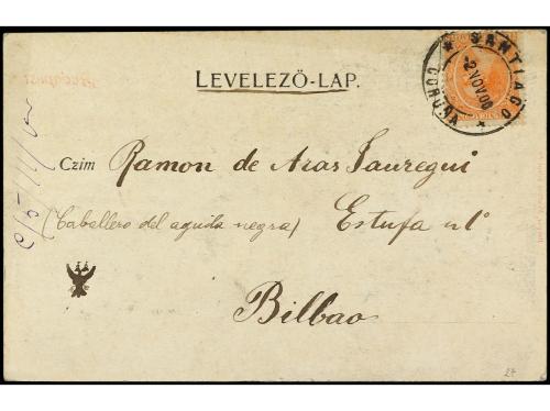 ESPAÑA. Ed. 218. 1900. TARJETA POSTAL escrita en Budapest y puesta al correo en Santiago (Coruña) dirigida a Ramón de Aras Jauregui miembro de la masonería y uno de los fundadores del Athletic Club (de Bilbao) en 1898.
