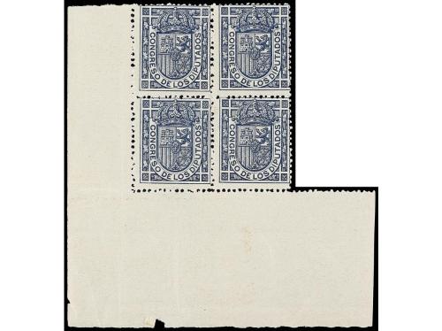 * ESPAÑA. Ed. 156A (4). 1 real azul claro. BLOQUE DE CUATRO con goma original, tipos 1/2, 13/4. Defectos al dorso. MUY RARO.