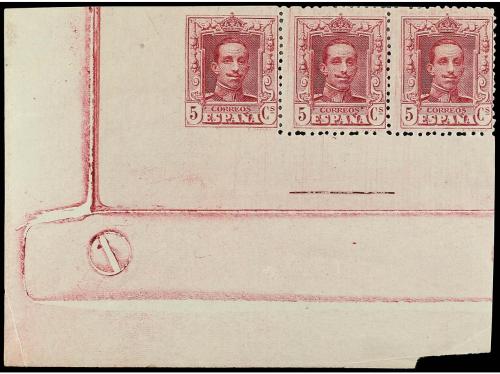 * ESPAÑA. Ed. 311dmd. 5 cts. lila SIN DENTAR por tres lados, tira de tres junto a dos normales. RARA. Cat. 245€.