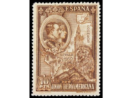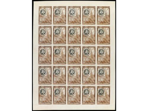 ESPAÑA. IBEROAMERICANA. ENSAYO DE PLANCHA. 10 pts. castaño y negro en hoja completa sin dentar de 25 sellos. Muy rara combinación de colores, probablemente solo exista esta hoja. (Gálvez 2830).