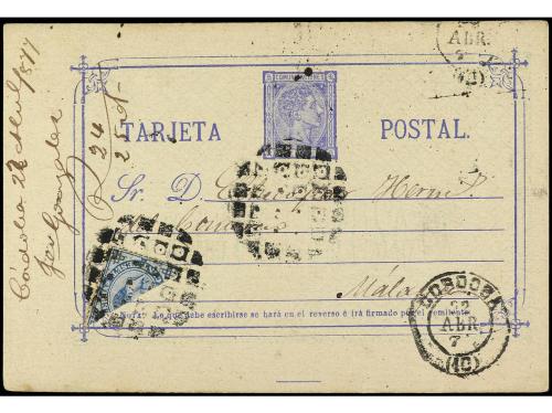 ✉ ESPAÑA. Ed. 184. 1877. CÓRDOBA a MÁLAGA. Entero Postal de 5 cts. azul con franqueo adicional de 10 cts. azul bisectado para el pago del Impuesto de Guerra. MUY RARA.
