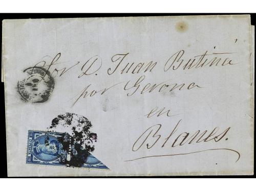 ✉ ESPAÑA. Ed. 175. 1876. CADAQUÉS a BLANES. 10 cts. azul, dos sellos uno bisectado usado para el pago de los 5 cts. del Imp. de Guerra, mat. círculo de puntos y fechador S. MARTI DE AMPURIES/GERONA.