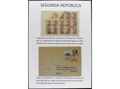 ✉ Δ ESPAÑA. SEGUNDA REPÚBLICA. Páginas de álbum con sellos bisectados sobre fragmento o carta. MUY INTERESANTE y RARO CONJUNTO.