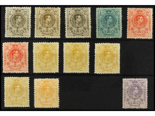 ** ESPAÑA. Ed. 267/271. MEDALLÓN. 2 c., 3 sellos con o sin número, 5 c., 10 c. (2), 15 c. violeta y 15 c. amarillo (5, dorso naranja o azul). Todos muy bien centrados.