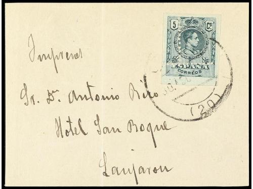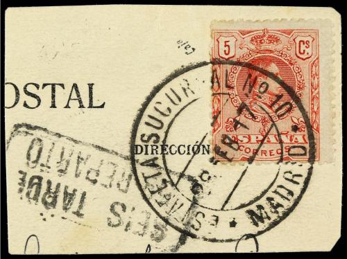 Δ ESPAÑA. Ed. 268ec. 5 cts. carmín ERROR DE COLOR sobre fragmento de tarjeta postal usada en Madrid (28 febr. 1917). EXTRAORDINARIAMENTE RARO, ÚNICO CONOCIDO en estas condiciones. Cert. CEM.