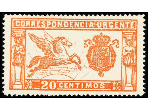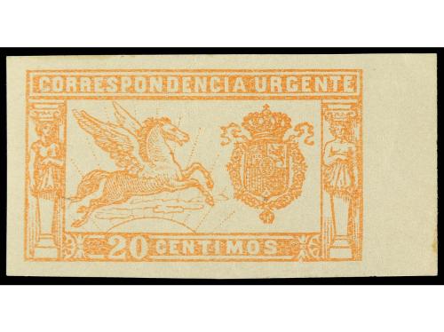 ** ESPAÑA. Ed. 256td. 20 cts. rojo. MANCHA BLANCA DELANTE DE LA "U" DE URGENTE. Centrado excepcional. LUJO.