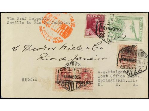 ✉ ESPAÑA. 1930. SEVILLA a U.S.A. 1 pta. (3) carmín, 1 pta. verde y 4 pts. carmín. Circulada por Graf Zeppelin, marca del vuelo y llegada al dorso.