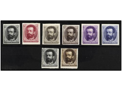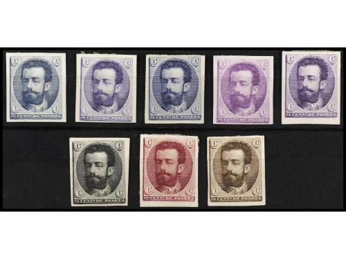ESPAÑA. 1872. PROYECTOS NO ADOPTADOS. Ensayos de plancha sobre cartulina. Conjunto de 8 sellos (Gálvez 836/41) más variedades de color.