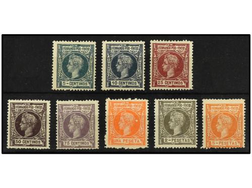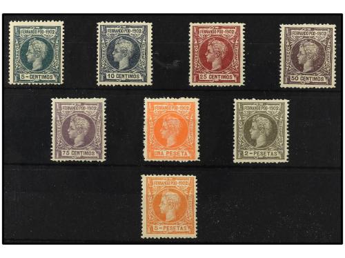 ** COLONIAS ESPAÑOLAS: FERNANDO POO. Ed. 110/7. SERIE COMPLETA, 8 valores. 2 pts. con señal de fijasellos y 5 pts. numeración ceros. Se incluye Ed. (*) 94.