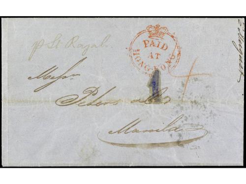 ✉ FILIPINAS. 1859. SINGAPORE a MANILA. Circulada vía Hong Kong donde se le aplicó la marca PAID/AT/HONG-KONG y tasada a la llegada con 1 real de plata.