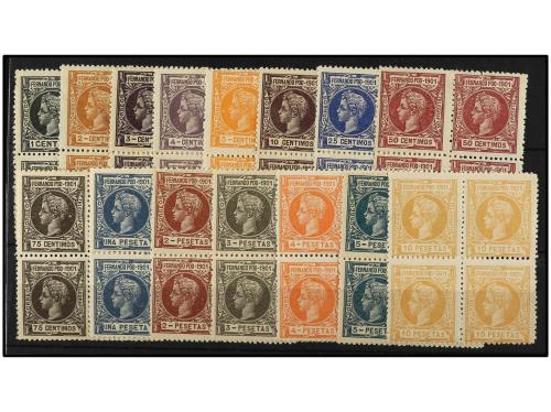 ** COLONIAS ESPAÑOLAS: FERNANDO POO. Ed. 95/109 (4). 4 SERIES COMPLETAS. 15 valores en bloques de cuatro. RARA sin fijasellos. Cat. 2.600€.