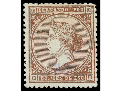 (*) COLONIAS ESPAÑOLAS: FERNANDO POO. Ed. 1. 20 c. castaño, buen ejemplar. Marquilla azul al dorso, traspasa algo al frente. Cert. COMEX. Cat. 1.000€.
