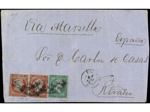 ✉ FILIPINAS. Ed. 6a, 6b. 1865. MANILA a RIVADEO. 1 real verde y 2 reales carmín (2), mat. parrilla. Tarifa de 5 portes.