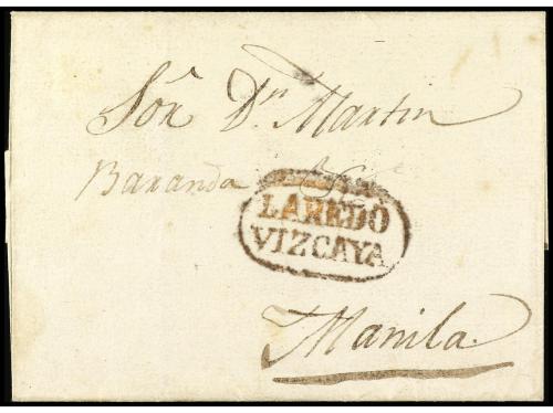 ✉ FILIPINAS. (1837 ca.). LAREDO (España) a MANILA. Marca LAREDO/VIZCAYA en rojo. RARÍSIMA dirigida a Filipinas.