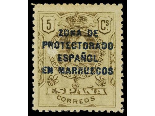 * COLONIAS ESPAÑOLAS: MARRUECOS. Ed. 59ec. 5 cts. castaño oliva. ERROR DE COLOR. Ínfima raspadura al frente. MUY RARO. Firmado GÁLVEZ. Cat. 720€.