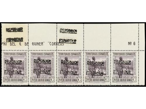 * COLONIAS ESPAÑOLAS: GUINEA. Ed. 221A. 20 cts. violeta tira de cinco, dos sellos doble habilitación en el borde de hoja. PRECIOSOS.
