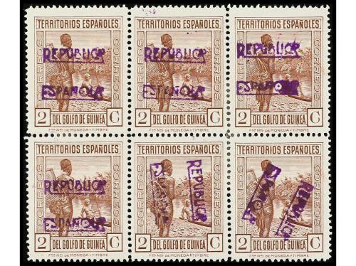 * COLONIAS ESPAÑOLAS: GUINEA. Ed. 217Bhi. 2 cts. castaño. Bloque de seis, un sello HABILITACIÓN VERTICAL y otro EN DIAGONAL INVERTIDA.