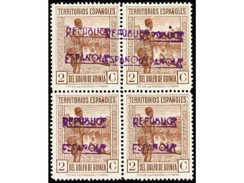 * COLONIAS ESPAÑOLAS: GUINEA. Ed. 217Bhh. 2 cts. castaño. Bloque de cuatro DOBLE HABILITACIÓN a caballo entre los sellos.