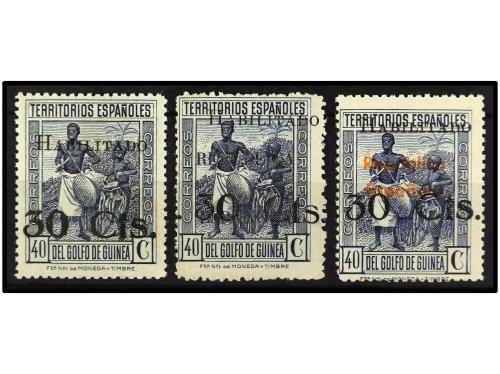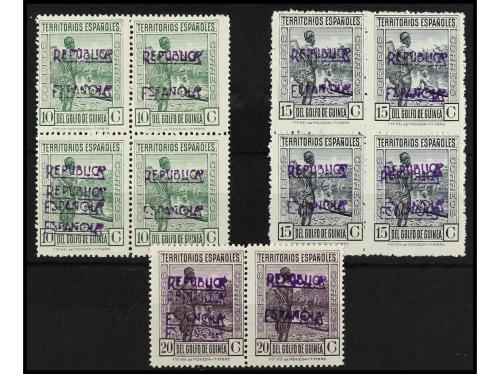 * COLONIAS ESPAÑOLAS: GUINEA. Ed. 219B/21Bhh. 10 cts., 15 cts. bloques de cuatro y 20 cts. pareja, un sello HABILITACIÓN DOBLE.